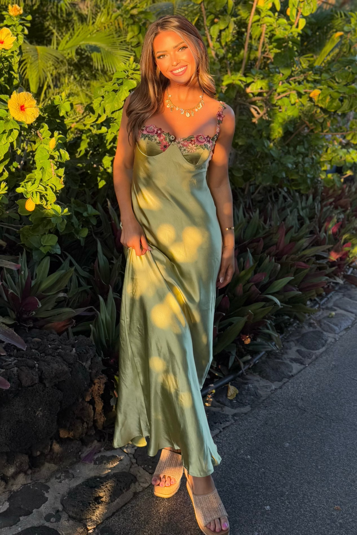 A Hui Hou Green Satin Floral Stitch Detail Maxi Dress