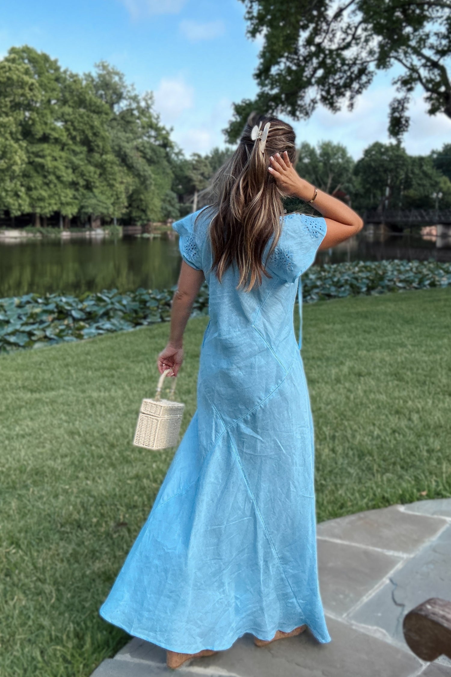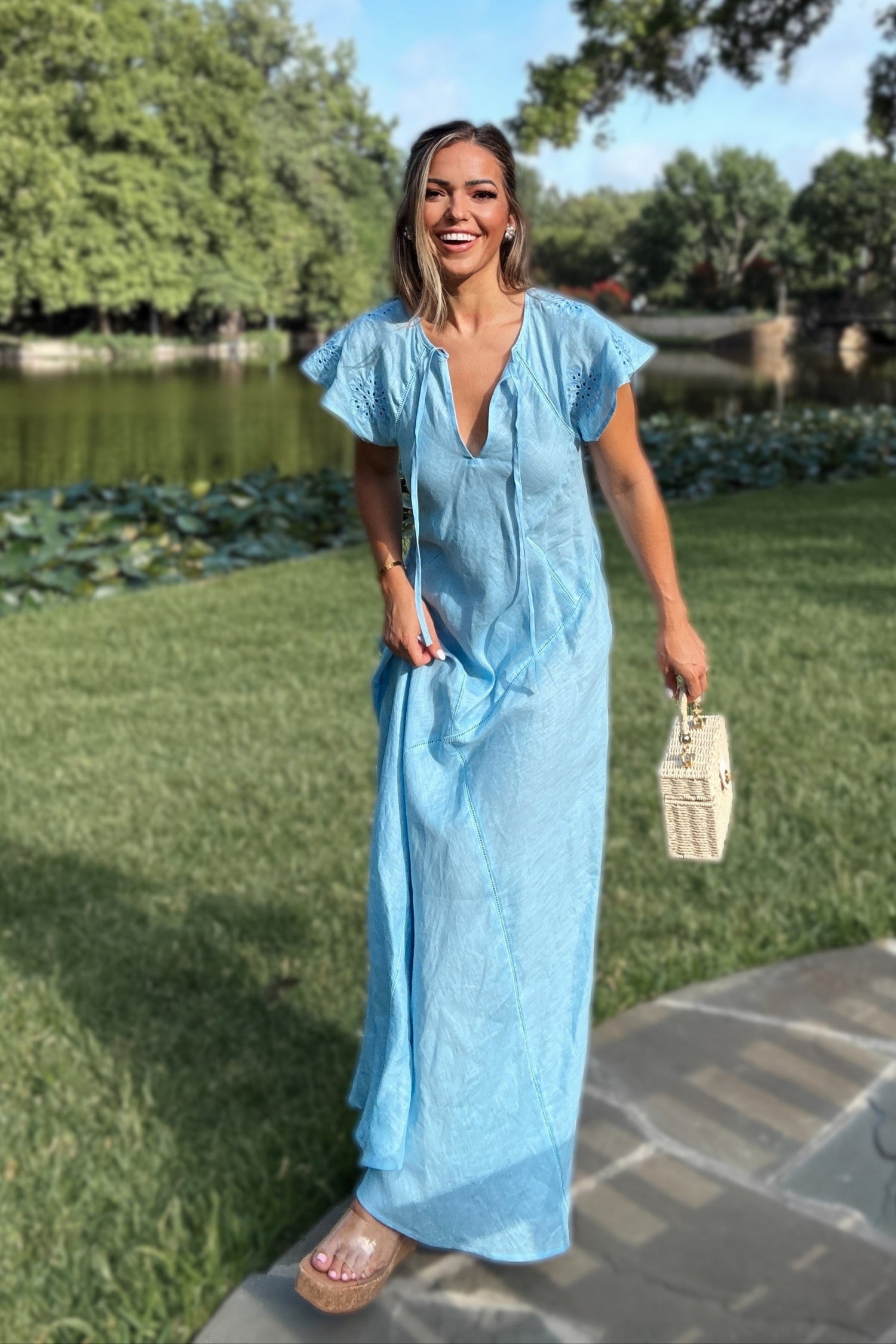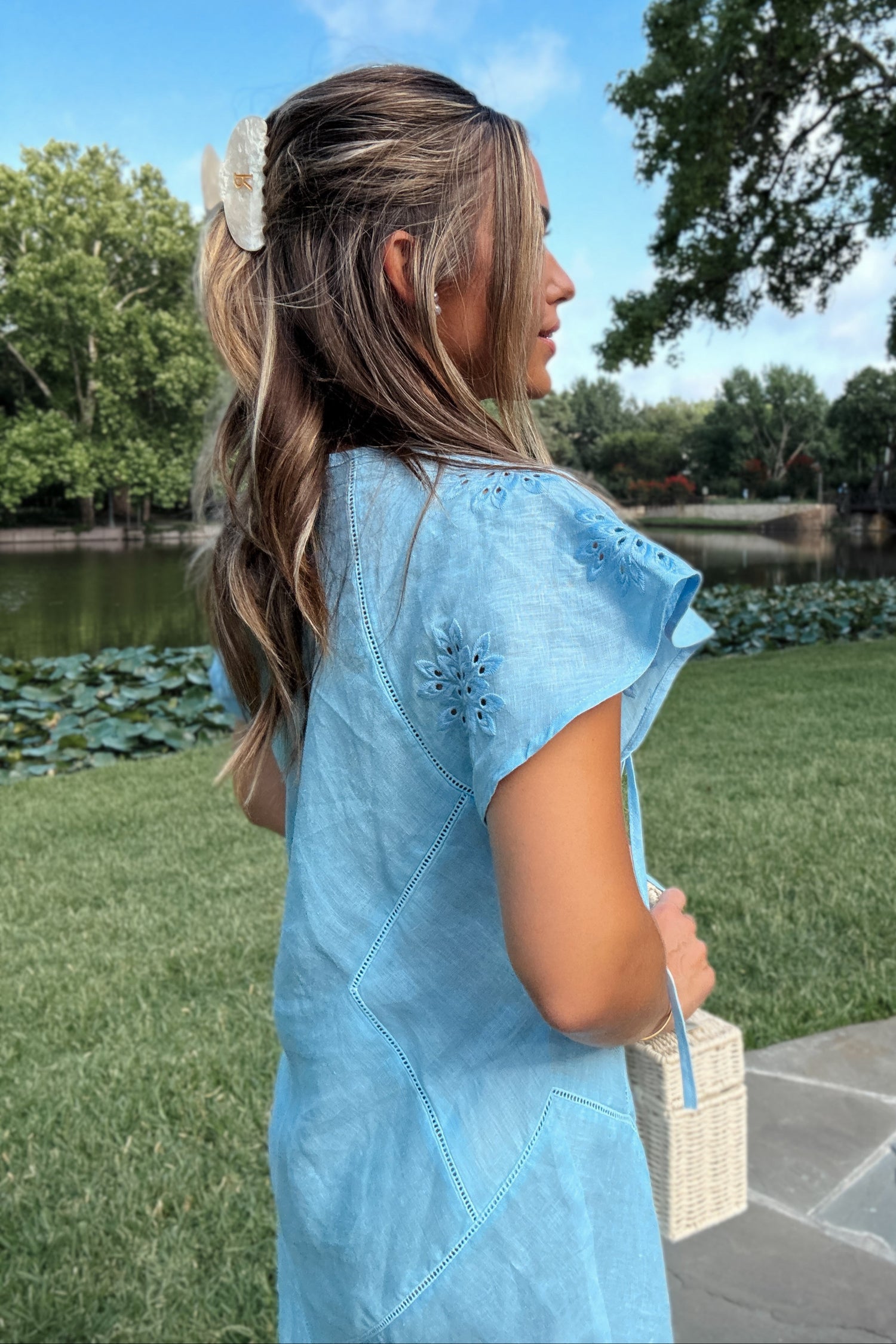 Soft baby blue with the sweetest subtle eyelet sleeve — floaty, feminine, and full of southern charm.