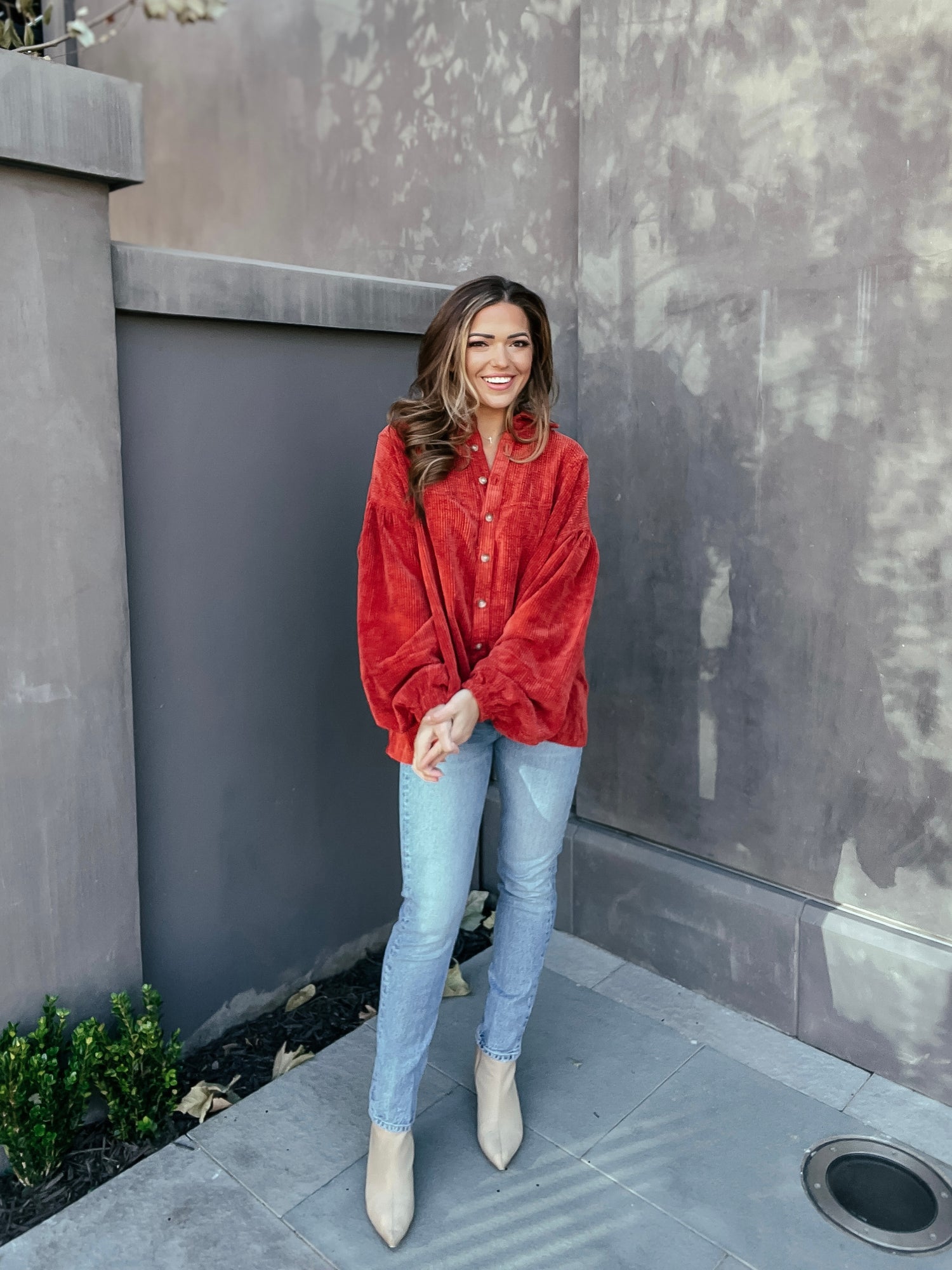 Ladies, if this isn't shacket love, we don't know what is? This one is so versatile and easy to wear. The beautiful red-toned rust color with the slight balloon sleeve detail--we can't get enough of. We're always looking for outfits that look cute and casual to conquer the weekend to do list and can go straight into lunch with friends.