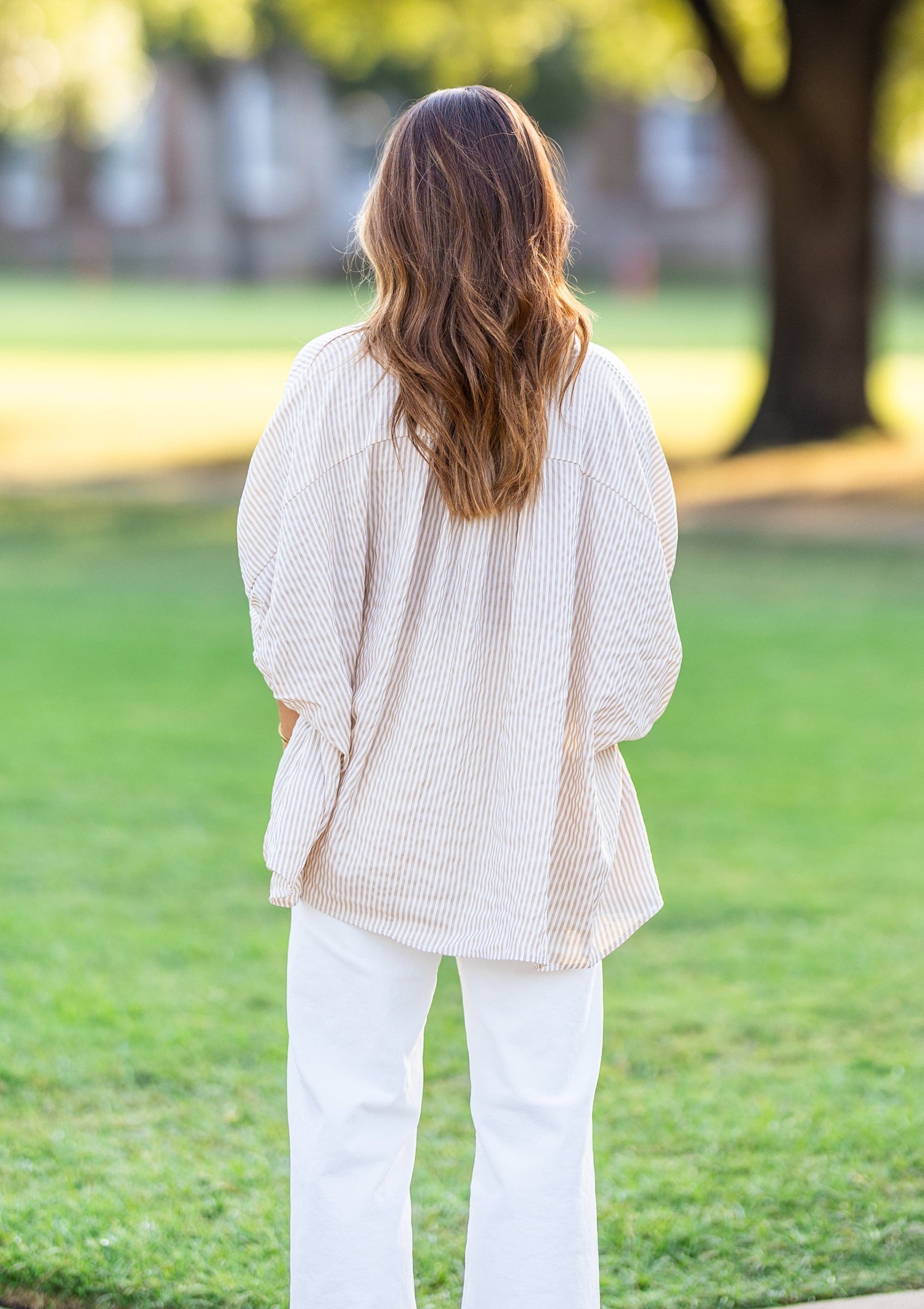 Stay stylish and comfortable every day with the Jen Taupe Striped Button-Down Top. Crafted from lightweight fabric, this top is designed to offer maximum comfort throughout the day. Perfect for the office or an everyday look.