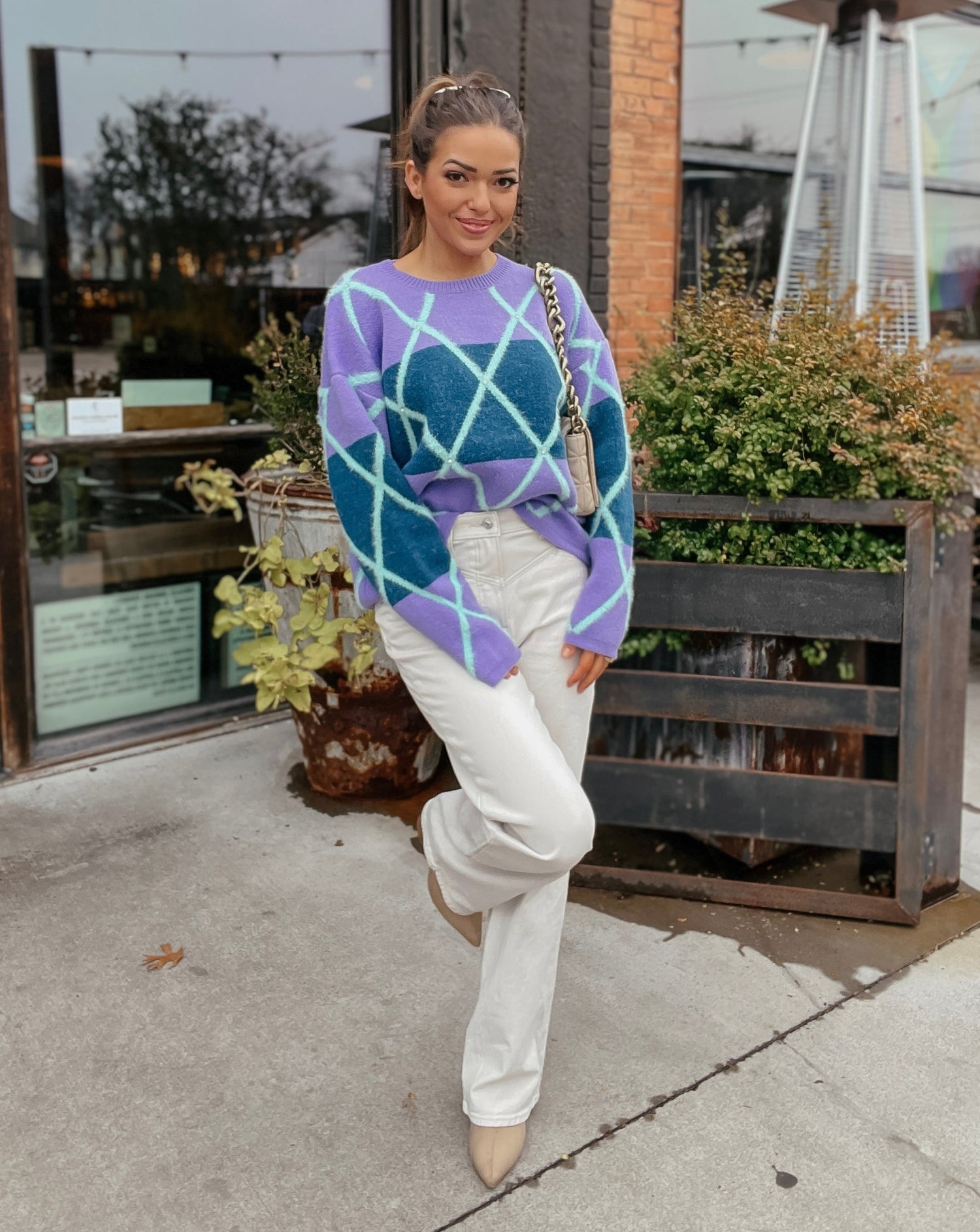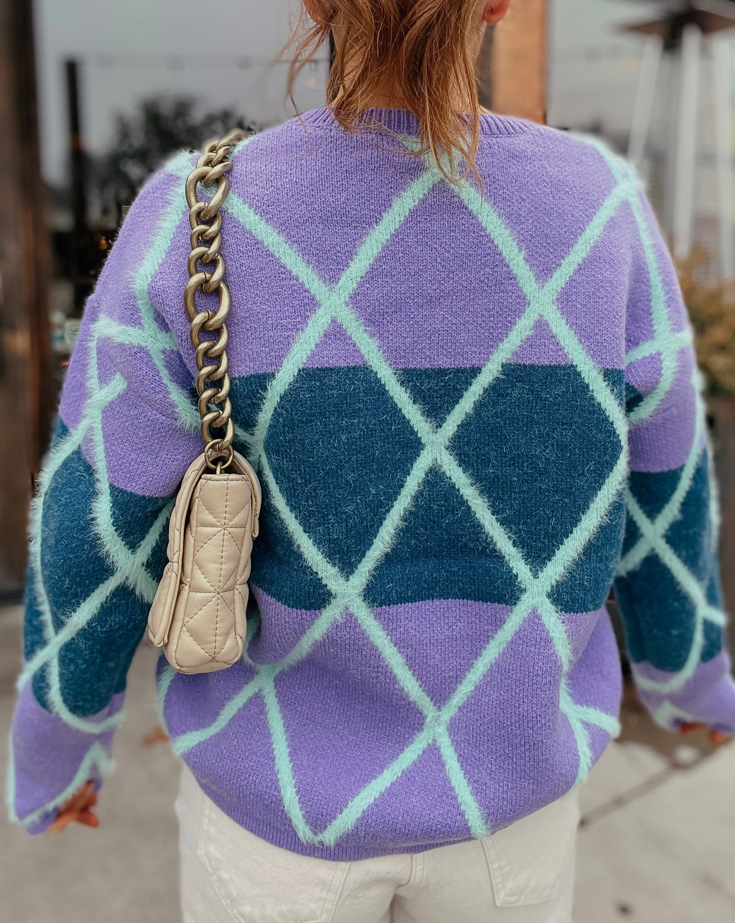 Stay cozy and stylish in our Morgan Purple and Navy Diamond Knit Sweater! Made of soft, warm material, this sweater is perfect for cooler days. With its eye-catching diamond knit design and unique color combination, you'll stand out in the best way possible.