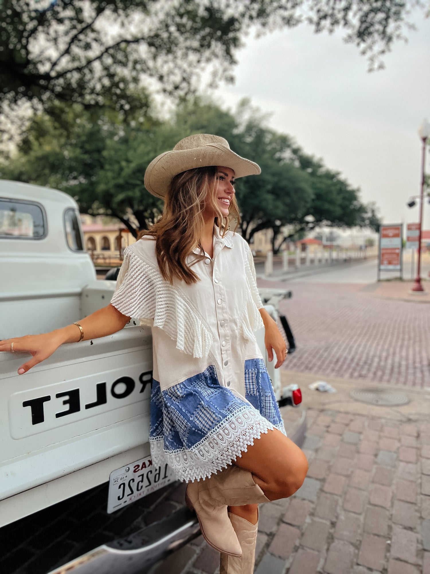 Pretty Heart Patchwork Ivory and Denim Button Down Dress
