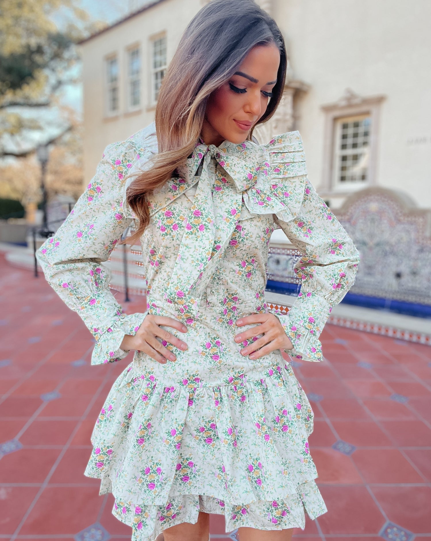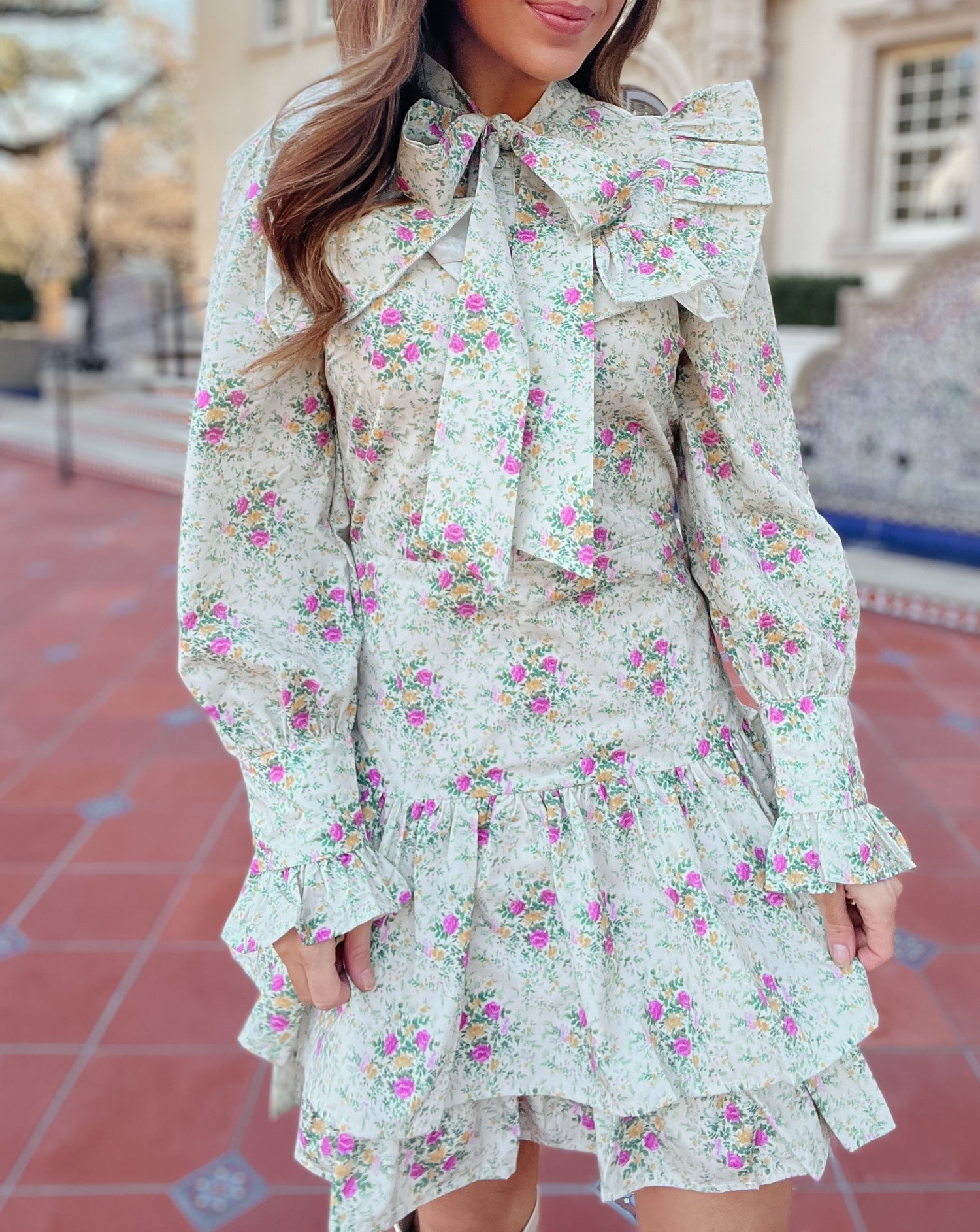 Saddle up in style with the Quinlynn Taupe Floral Ruffle Bow Dress. This versatile dress is perfect for any occasion, whether you're hitting the rodeo in your cowgirl boots or stepping out in the spring sun with wedges. With its playful ruffle and bow details, you'll be the talk of the town. Giddy up and grab yours today!
