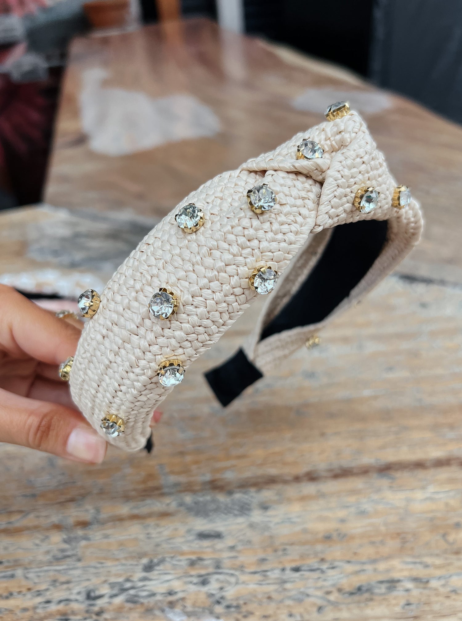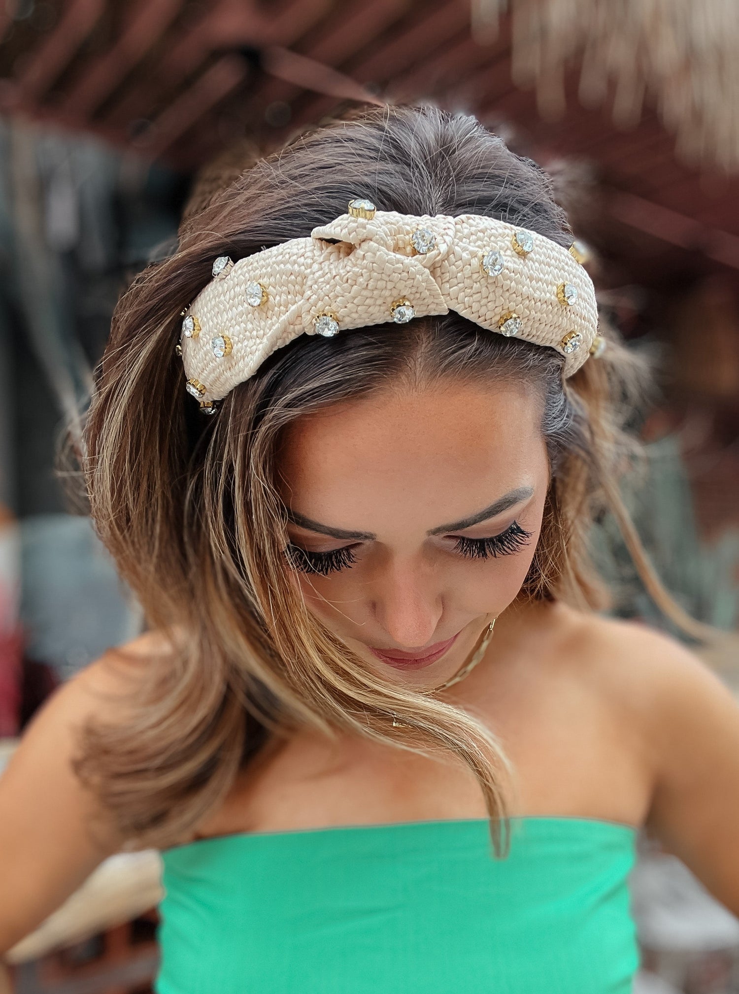 Be the belle of the beach in this cute beige raffia headband, sparkling with rhinestones! Whether you’re strolling by the shore or picnicking in the park, this summery accessory will give your look some incomparable flair!