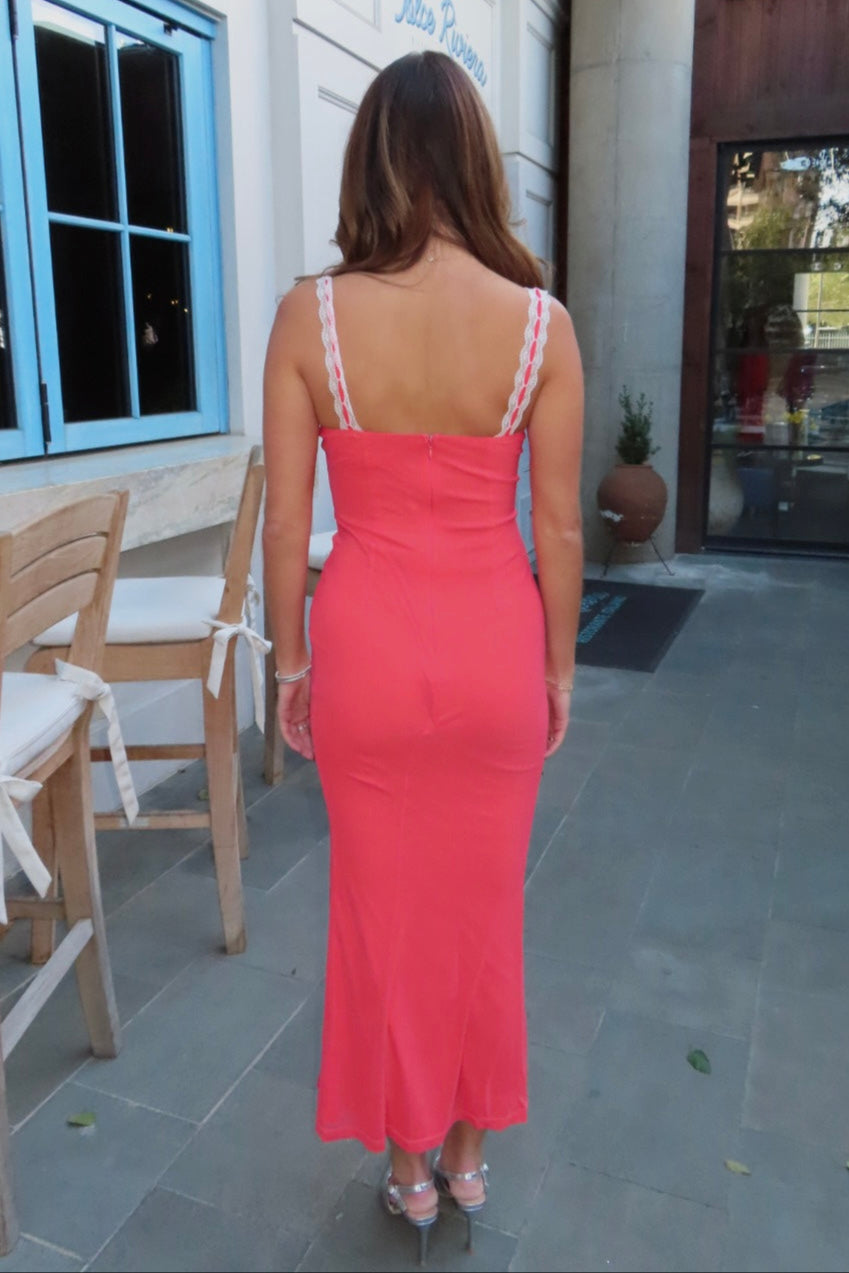 Heartbreaker Red Mesh Ribbon Trim Maxi Bodycon Dress