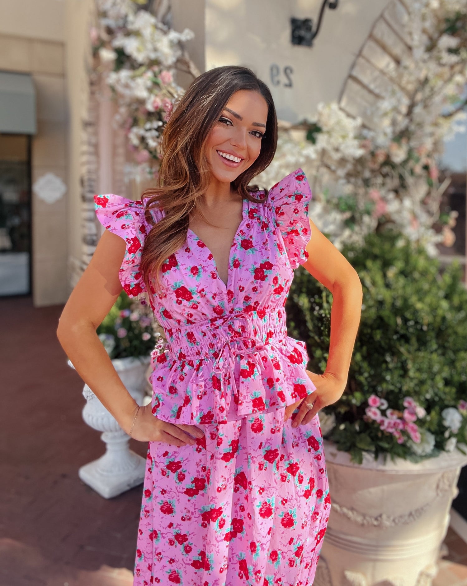 Skylar Pink and Red Floral Smocked Bow Tie Midi Dress