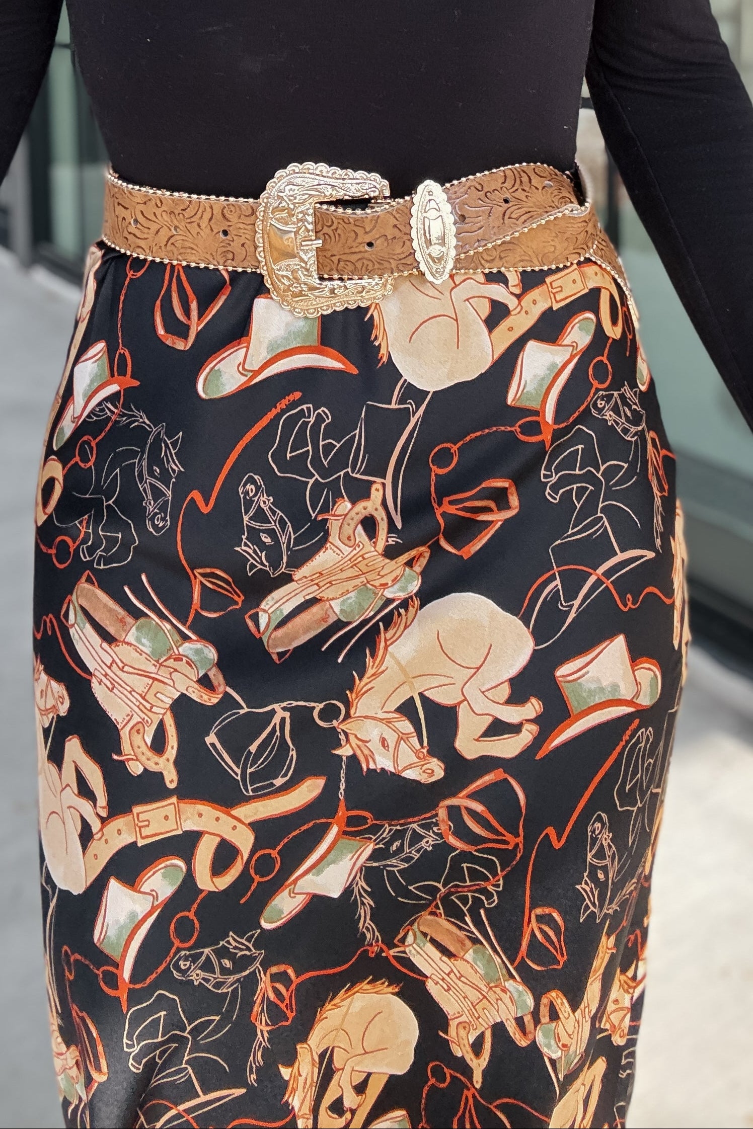 Lainey Western Print Black Satin Maxi Skirt